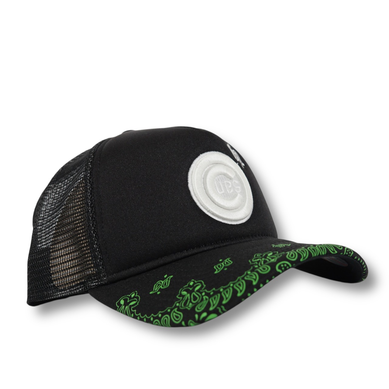 バイザーをペイズリー柄にデザインしたロゴが暗闇で光る蓄光素材のキャップ